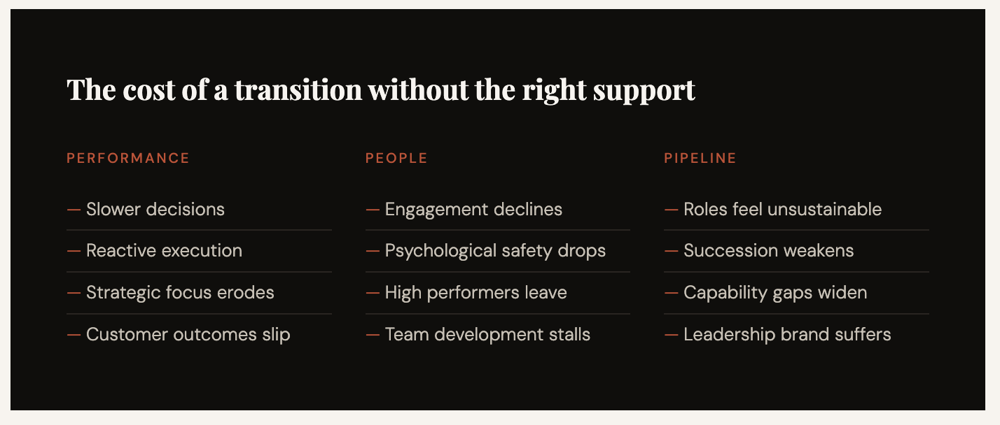 An unsupported leadership transition rarely stays contained to the individual. It moves through the team, the function and, over time, the organisation's pipeline.
