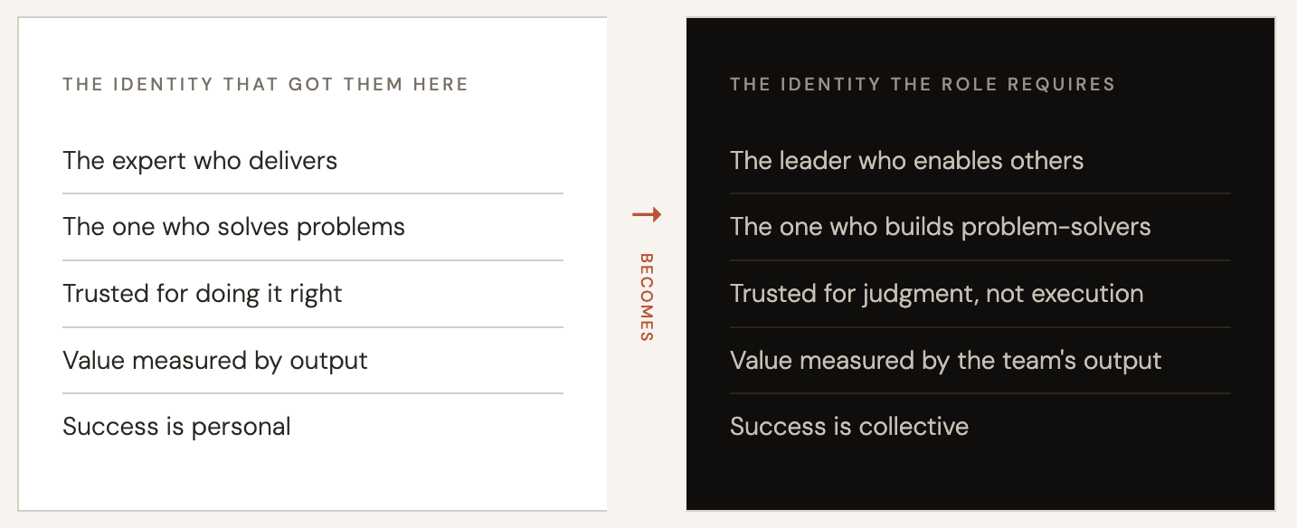 For years, their identity has been built around being the one who delivers. The expert. The reliable one. The person who gets things done. That identity served them well. It's why they were promoted.